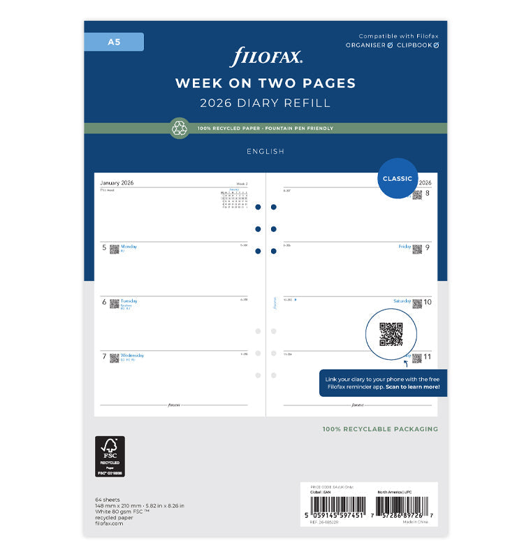 Udělejte dnes něco ekologického s tímto klasickým kalendářem A5 s rozložením týden na 2 strany ze 100% recyklovaného papíru. Pouze v anglickém jazyce.